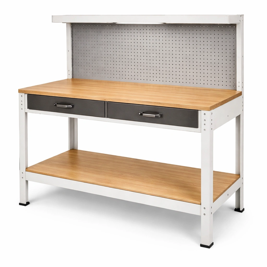 Banco de trabajo de acero y madera con panel perforado 150x60x160 cm