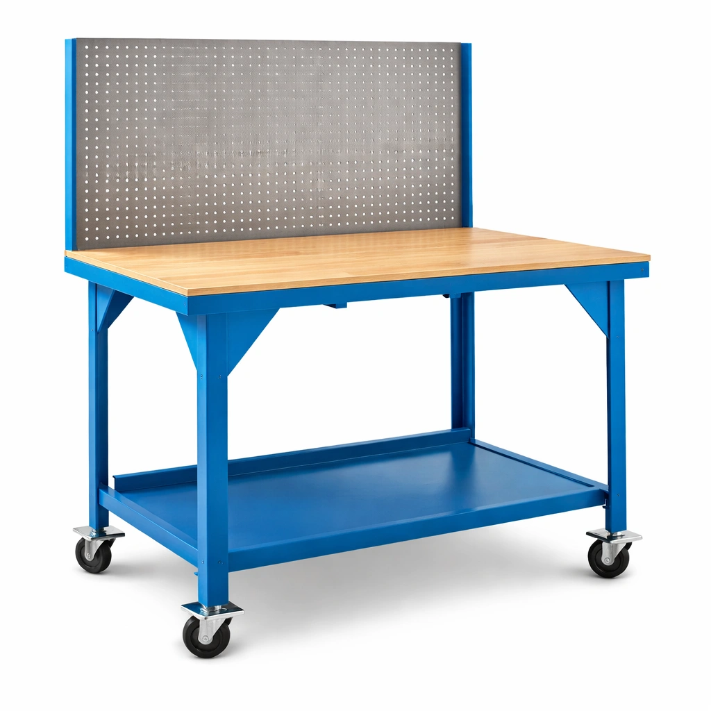 Banco de trabajo móvil con tablero de madera y marco de metal